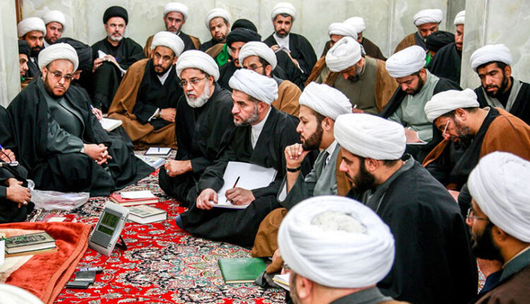 ایران میں ابتدائی/پرائمری مرحلے کو ”مقدمات“ کہتے ہیں۔ اس مرحلے میں طالب علموں کو نصاب میں شامل بنیادی عربی، فارسی، گرائمر، منطق، فقہ و اصولِ فقہ سے آشنائی، عرصہ چھ سال تک پڑھائے جاتے ہیں۔ اس کے بعد ہائی سکول لیول جسے ایران میں ”سطح“ کہا جاتا ہے، میں فقہ، اصولِ فقہ، قرآن، تفسیر، حدیث، کلام اور فلسفہ کی تدریس قدرے تفصیل کے ساتھ عرصہ چار سال تک پڑھائے جاتے ہیں۔(یاد رہے، کہ درج بالا مرحلوں کے دوران بحث و مباحثہ اور خطابت پر بھرپور توجہ دی جاتی ہے) درس خارج: یہ مرحلہ چار سال اور مزید کچھ سالوں پر محیط ہوتا ہے، جس میں زیادہ تر توجہ تخیل و قیاس کے ذریعے(خود بقول ان کے) جدید مسائل کا شرعی حل نکالنے پر مرکوز ہوتا ہے، جیسے فقہ قیاسی بھی کہا جاتا ہے۔ دراصل یہ مرحلہ رتبہ مجتہد کی طرف لے جاتا ہے۔ کئی عوامل کی بنا پر طلبا کی ایک نہایت محدود تعداد درس خارج میں شامل ہوتی ہے، جس میں زیادہ تر ایرانی اور عرب ہوتے ہیں۔